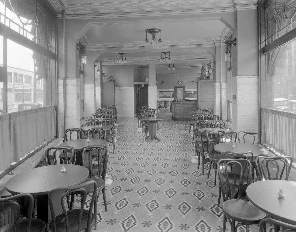 Here’s what the Europe Hotel looked like in 1931 when it had a beer parlour on the main floor — notice the spitoons on the floor by tables.