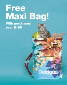 Free Desigual bag when you spend $169 at Angel. It makes a great beach bag. And it fits a cat & a watermelon.