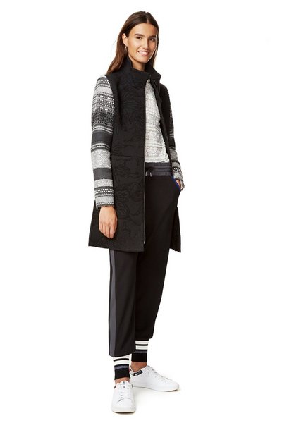 Desigual MOON coat. $425.95. FW2017. Women’s flared black coat with silver zip, high neck and print sleeves in grey tones.