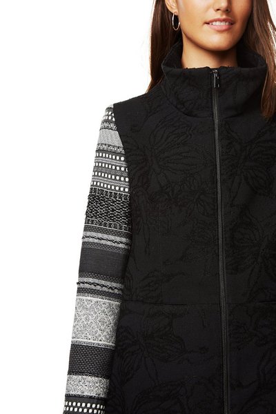 Back of Desigual MOON coat. $425.95. FW2017. Women’s flared black coat with silver zip, high neck and print sleeves in grey tones.