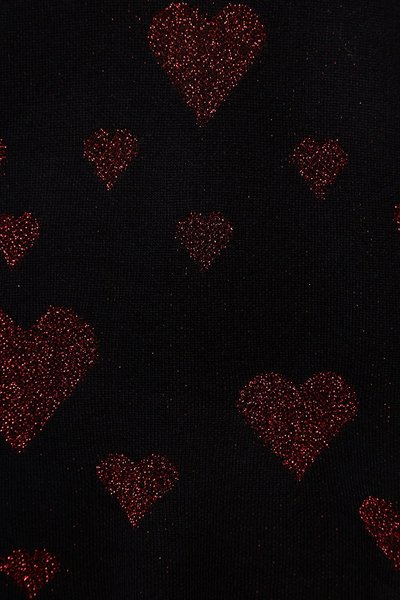 Close-up of metalized fibre hearts of Desigual AFRICA sweater. $165.95, minus 30%.