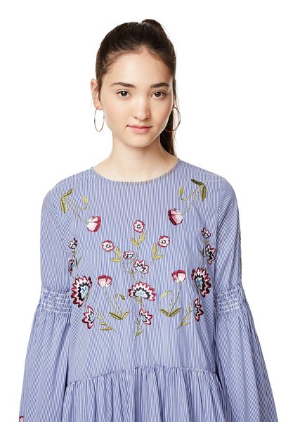 Embroidery detail. Desigual BLUE 2 striped cotton dress with flared sleeves & embroidery. $189.95. FW2017.