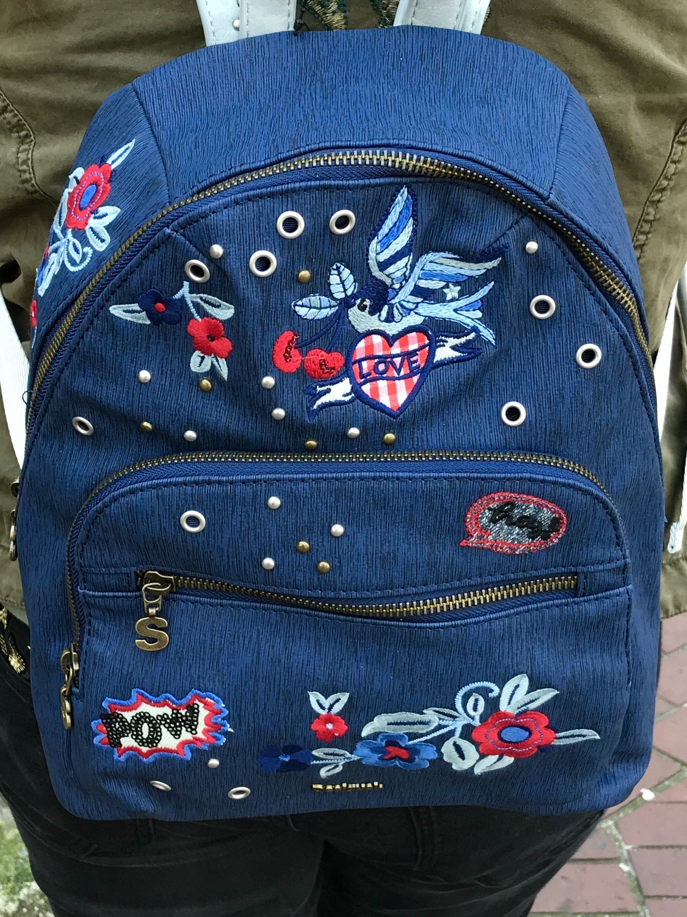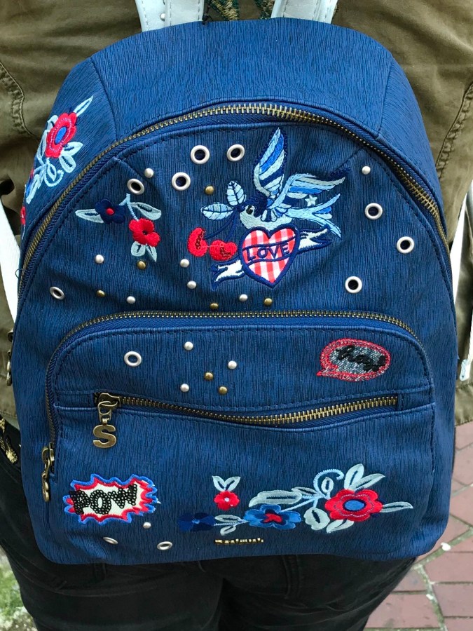 This Desigual backpack has a heart, bluebird and flowers. SS2018.