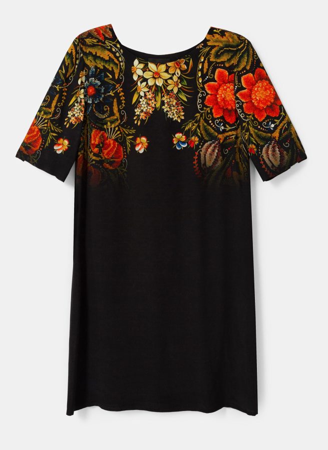 Wear the most elegant and colourful boho aesthetic with this straight three-quarter sleeve dress with skirt above the knee. Its flowing and comfortable drape enhances its floral print on the sleeves and around the neck, designed by Mr. Christian Lacroix.