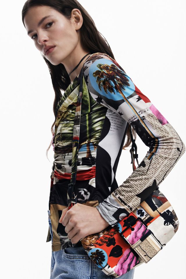 Desigual NEWSPAPER button-front T-shirt by Christian Lacroix. Made in Morocco. $139. SS2025.