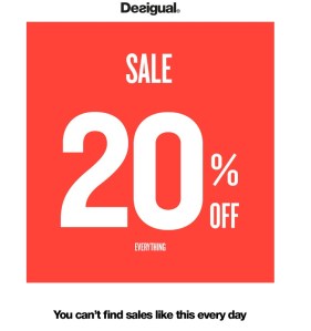 We’re having a summer clearance sale right now: 15% off all Desigual summer wear for men and women, 20% off Desigual summer wear for kids and up to 35% off select Desigual styles.