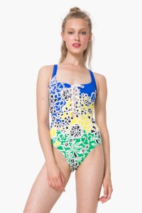 Desigual one-piece swimsuit worn by Charli Howard, who got pissed off when her modelling agency dropped her because she was “too big” — she was a size 6. She now is a body-positive activist who believes the fashion industry should include more diversity, including normal-sized women: “We believe all body shapes, ages and ethnicities deserve to be represented in fashion and in the media, helping girls worldwide feel positive and confident about themselves, regardless of what they look like or whatever ‘flaw’ they might think they have. We love an un-retouched beautiful woman!”